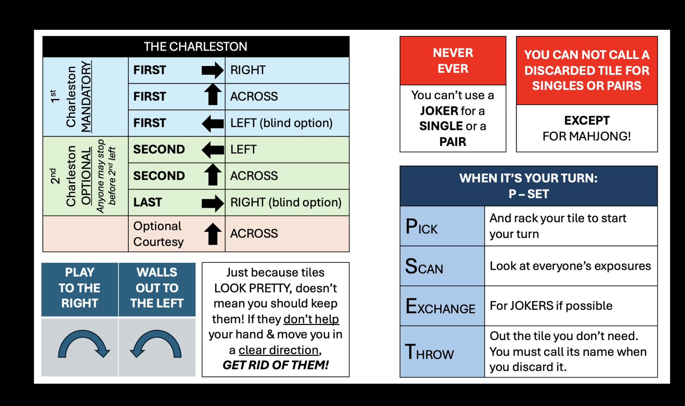 Mah Jongg tip sheet For New Amercian Players,You/they can print it out, fold it in the middle and laminate it, then new players can keep […]